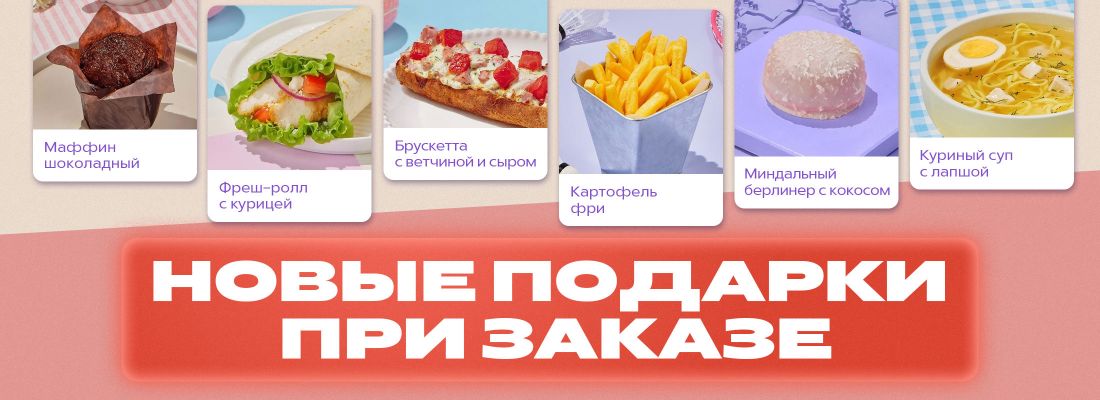 В акции участвуют следующие подарочные позиции: Куриный суп с лапшой, Луковые кольца, Маффин шоколадный, Миндальный берлинер с кокосом, Онигири с курицей терияки - На заказы свыше 2050 рублей с учетом напитков.